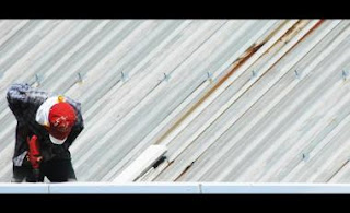 Kebranian brada diatas atap untuk memperbaiki talang,